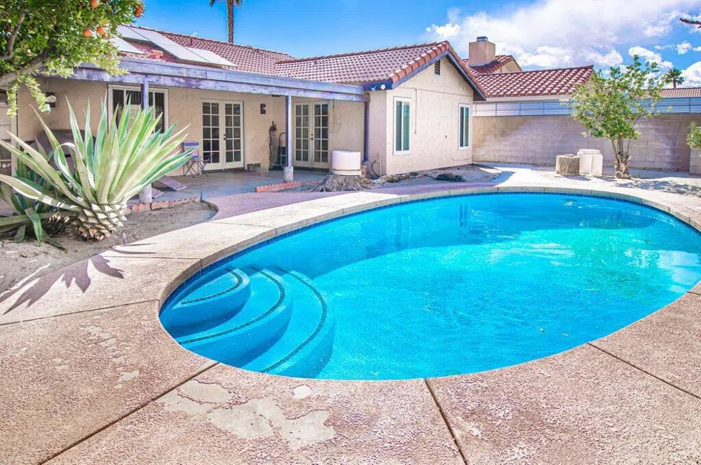 3 BR, 2 BA, nearly 1700 sq ft! Look at these features: updated kitchen with new dishwasher, gas stove and windows; updated master bath with walk-in shower. Home has been freshly painted and tiled throughout. Living Room has elegant fireplace and wetbar. Attractive backyard pool is surrounded by citrus, mango and fig trees. Attached 2-car garage. Convenient location near shopping, restaurants and services on Ramon near Date Palm. All furniture pictured is included, including a brand new electric bed & mattress and loveseat in primary bedroom! See inventory list attached. Buyer to take assignment of Sunrun solar panel lease. Buyer to confirm years remaining.