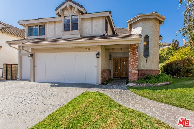 Incredible 5 bed 3 bath home situated in one of the best locations "Chateu Creek". Double doors entry to a large open floor plan, high vaulted ceilings & a beautiful dark stained sweeping staircase. Gourmet kitchen features white tile , dual sinks and dishwasher. 1 bedroom and bathroom on conveniently located on first floor for guests. 3 car garage. Family room/den with custom stacked stone fireplace and views of back yard. Spacious formal office or a 5th bedroom. The second floor boasts a balcony and beautiful built in wooden library. Separate air conditioner units for both up & downstairs. Spacious master suite with sitting room, and dual sink bathroom. Extremely private and quiet neighborhood in the Las Virgenes School district.