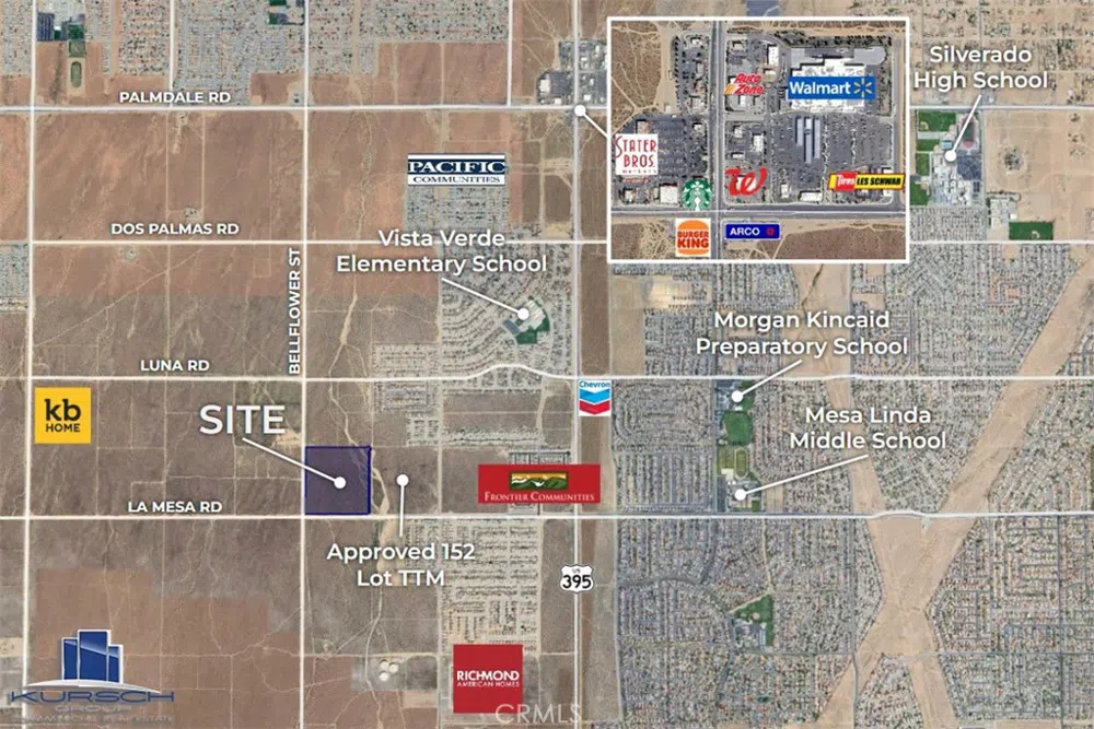 ±36.97-acre site approximately ¾ mile west of Highway 395 in Victorville. Zoned Very Low Residential as part of the Vista Verde Specific Plan, this parcel may allow for up to 3.8 units per acre. Water lines run along the east and south borders in Bellflower Street and La Mesa Road. Sewer is nearby with lines in Luna Road and Fremontia Road to the north and to the east at the La Mesa Road and Mesa View Drive intersection. Buyer to verify all zoning and utilities with the City of Victorville. Surrounded by active communities and future build sites from Frontier Communities, Richmond American, and KB Home. Snowline Joint Unified School District owns ±50 acres adjacent to the parcel with plans for a future school site. Located about 1.5 miles SW of The Crossroads at 395 shopping center which is home to businesses like Walmart, Stater Bros, and Starbucks.