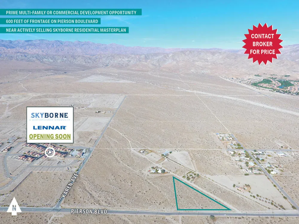 The subject prime 4.24 rare zoned acres on Pierson Boulevard (600 feet of frontage) provides the opportunity for up to 64 multi-family units and/or commercial near new major developments including the 2,000+ residential home Skyborne Masterplan. The City of Desert Hot Springs is booming, not only because of the current flee to well-located suburban markets with affordable housing, but also because of the fast growing cannabis industry in the city which is 'ground-zero' here for the state of California. The City of Desert Hot Springs was one of the first cities to adopt pro-cannabis development policies including cultivation, manufacturing, distribution, and retail - which has just recently brought in thousands of brand new jobs to the city (which also creates a higher demand for new single & multi-family development), and millions of dollars of new tax revenue to the city. With the major new increased growth and advancement in city finances and jobs, the city has been awarded an 'A+' rating (by California State Auditor), and Desert Hot Springs is now considered one of the most financially stable cities in the state.